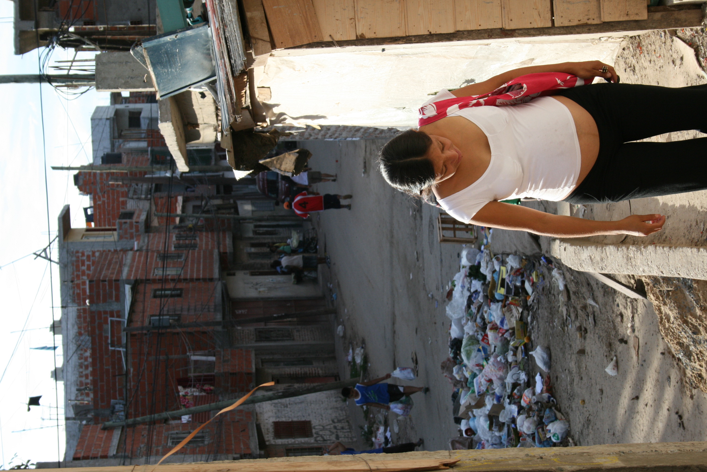Mujer embarazada entrando. Paisaje del barrio con bolsas de basura reventadas en segundo plano. Más lejana que la foto anterior, con un niño pasando detrás suyo, como saliendo del mismo lugar al que ella se dirige